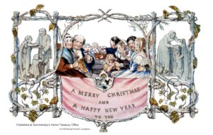 STARTING A TRADITION      With all of this resume building, it’s easy to imagine that in 1843 Cole was just too busy to write Christmas cards.  The custom at the time was to hand write each one individually, but that just wasn’t going to happen.  Cole hired London artist John Calcott Horsley to design a card for him to send to all his friends.  It was a triptych with scenes on each of the side panels depicting the charitable essence of Christmas: feeding the poor and clothing the homeless.  In the center was the message “Merry Christmas and Happy New Year To You” under a colorful drawing of a family celebrating, their wine glasses raised in a toast.  Horsley made 1,000 lithographic copies of his greeting card measuring 5 1/8 inches by 3 and 1/4 inches, and he hand colored each one himself.  The cards that Cole did not send were sold in the Felix Summerly art shop on Bond Street in London for six cents each.  Since it is estimated that there are only about a dozen still in existence, they have become quite collectible.  In December 2008 one sold for £8,500 (over $13,000 today).